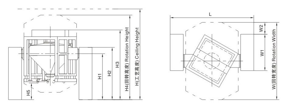 2、将方锥形料斗放入提升机构中,设备自动完成提升、夹持;料斗的对称轴线与回转轴线成一夹角,不同组成物料在密闭的料斗中进行三维空间运动,产生强烈翻转和扩散收缩作用达到最佳的混合效果;